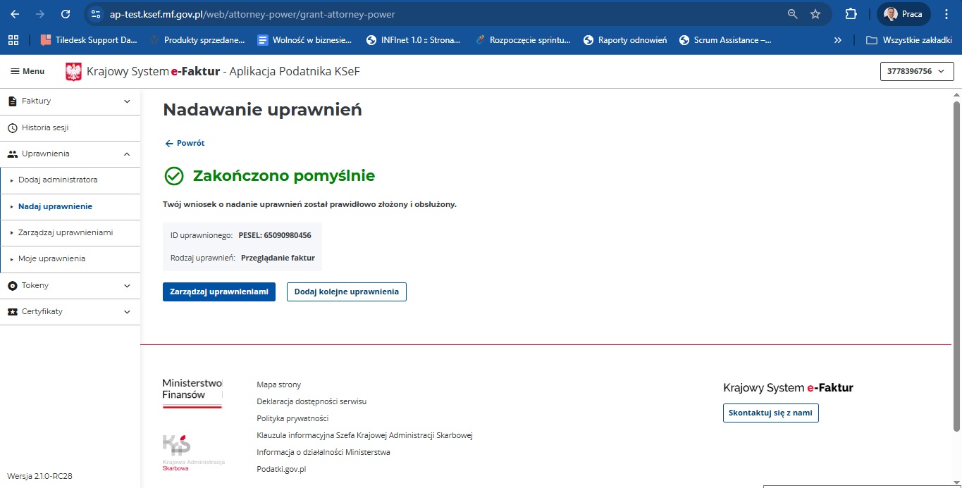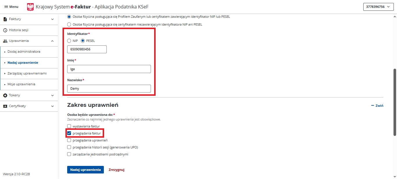 • Metoda 2 (Bez ZAW-FA): Uprawnienia można nadać, logując się Profilem Zaufanym (PESEL) lub e-dowodem (NIP/PESEL/dane unikalne podpisu), a następnie w sekcji „Uprawnienia” w KSeF przypisać zadania (np. wystawianie faktur, dostęp).
