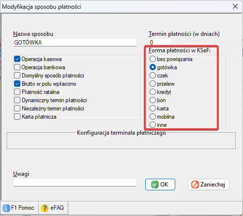 To ustawienie służy do mapowania wewnętrznego sposobu płatności z programu na sposób płatności przekazywany w strukturze FA(3) do KSeF. W FA(3) część dotycząca płatności jest elementem fakultatywnym i obejmuje m.in. termin płatności oraz formę płatności.