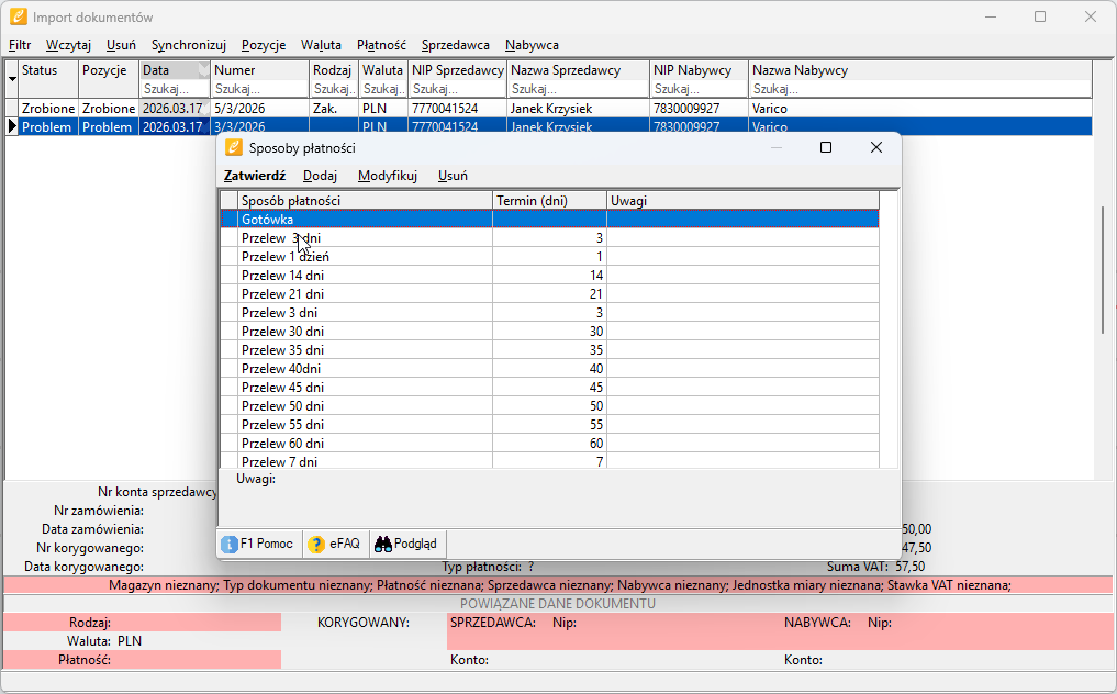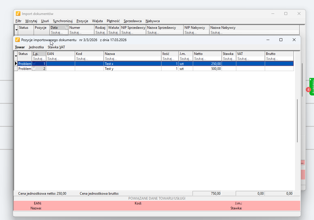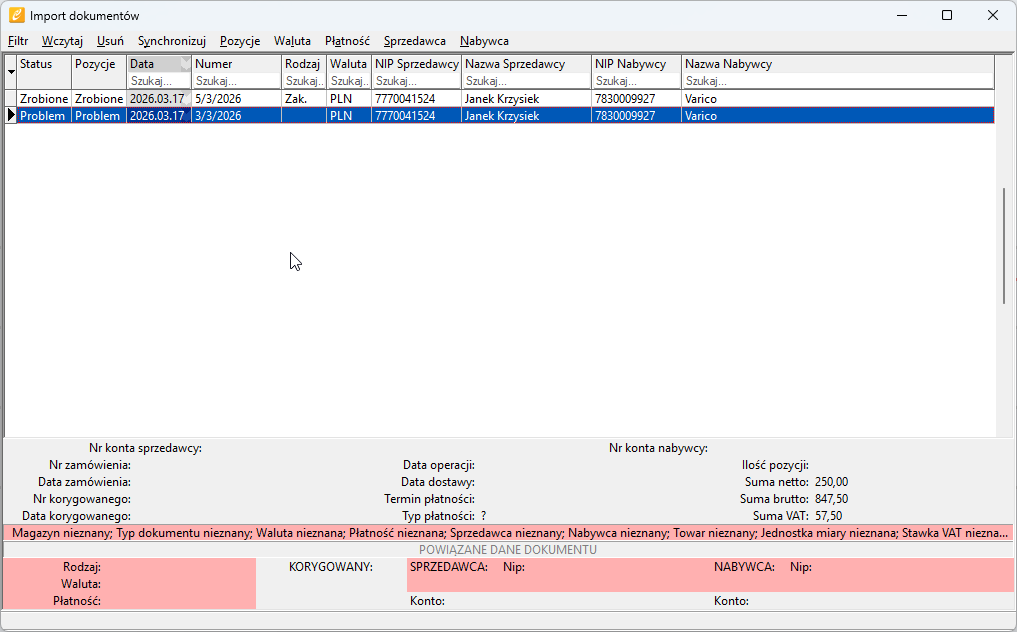 W trakcie importowania dokumentów należy skupić się na informacjach widocznych na czerwono. Wraz z dodawaniem kolejnych pozycji statusy „nieznane” będą się regularnie zmniejszać wraz z kolejno zatwierdzanymi pozycjami jak np. waluta, płatność towar itp.
