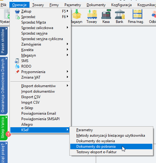 Na samym początku musimy przejść do pobierania faktur zatem wchodzimy do Operacje -> KSeF -> Dokumenty do pobrania: