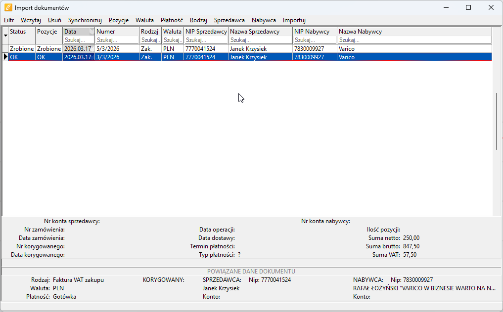 • Filtr – Pozwala na filtrowanie zaimportowanych dokumentów według statusu widocznego z lewej strony