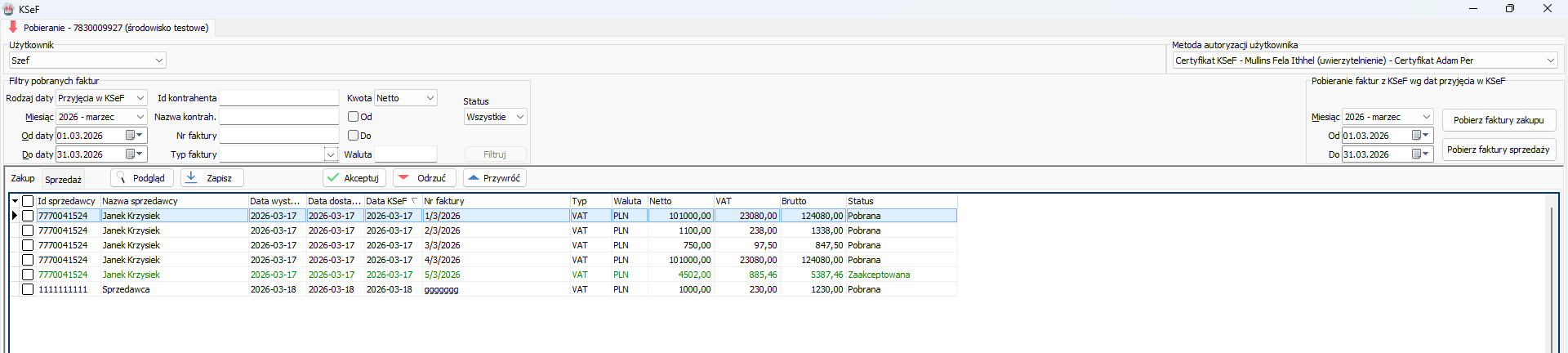 • Pobierz faktury sprzedaży – pozwala na pobranie faktur sprzedażowych z KSeF