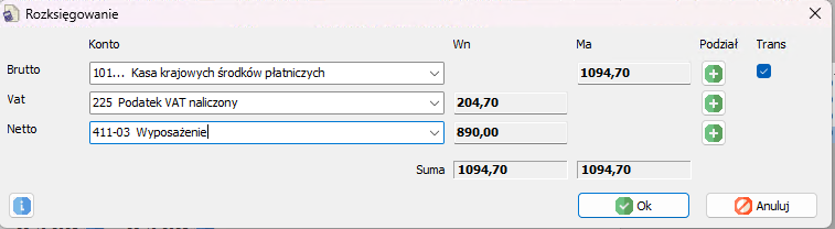 W dialogu Rozksięgowywanie uzupełniamy konto, a następnie zatwierdzamy przyciskiem OK.