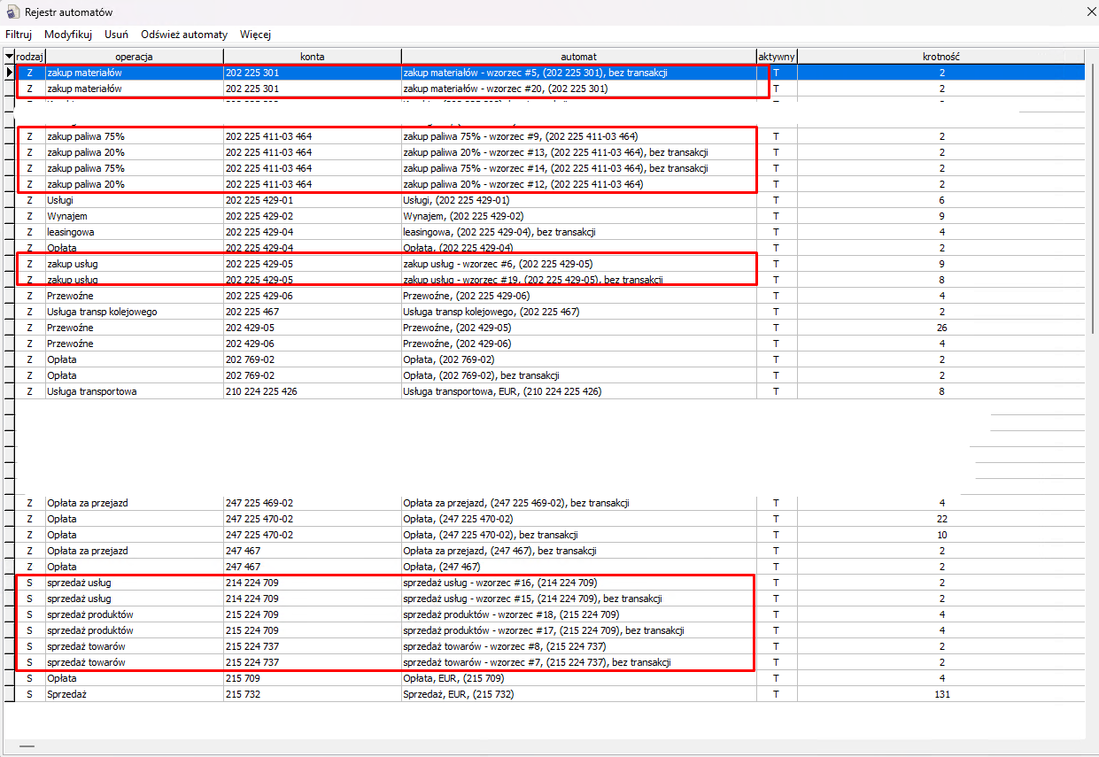 Rozpoczynając pracę z programem mamy dostępne wzorcowe automaty księgowania. Są one dołączone automatycznie. Rozpoznać je możemy poprzez oznaczenie wzorzec #numer.