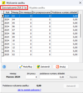 W programie RP mogą Państwo szybko przygotować zaświadczenie ZUS Z-3a. Jest to formularz wymagany w przypadku ubiegania się o wypłatę zasiłku (np. chorobowego) w tym przypadku dla osoby zatrudnionej na podstawie umowy zlecenia.